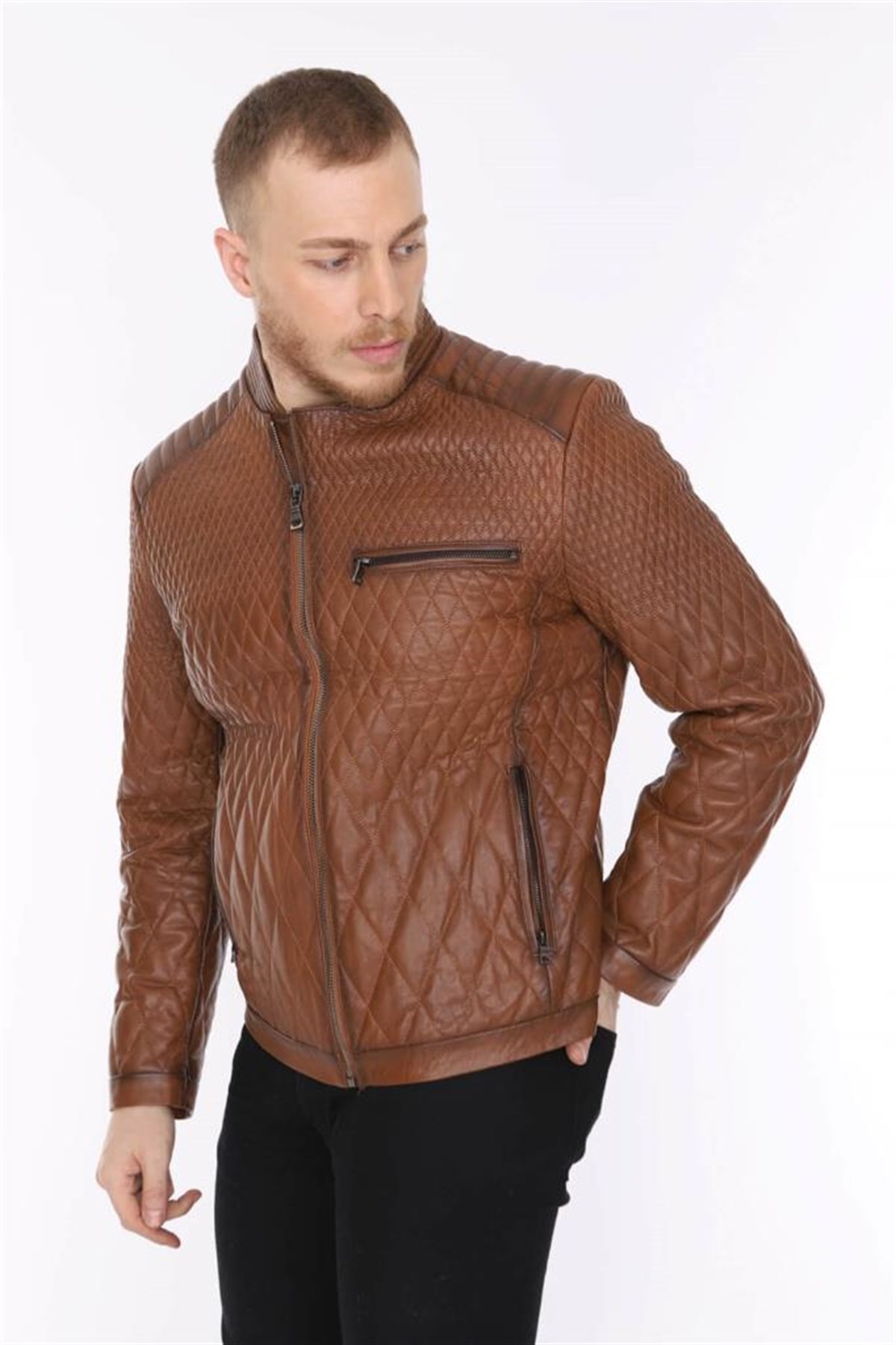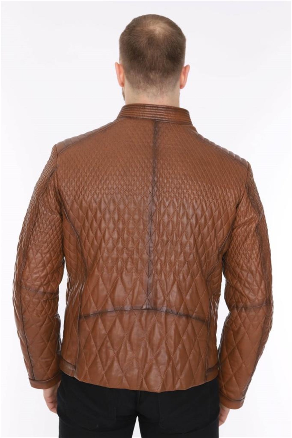 Hakiki Deri Taba Erkek Deri Mont Baklava Desen Fermuarlı Deri Ceket (390-1671)