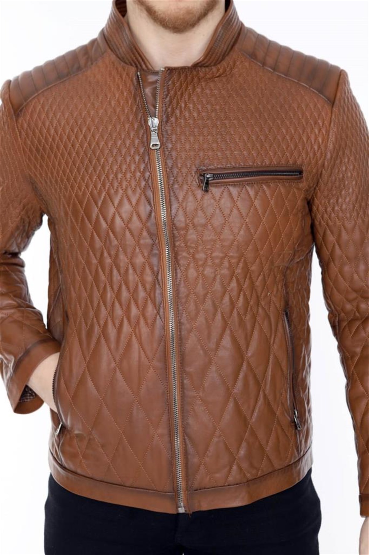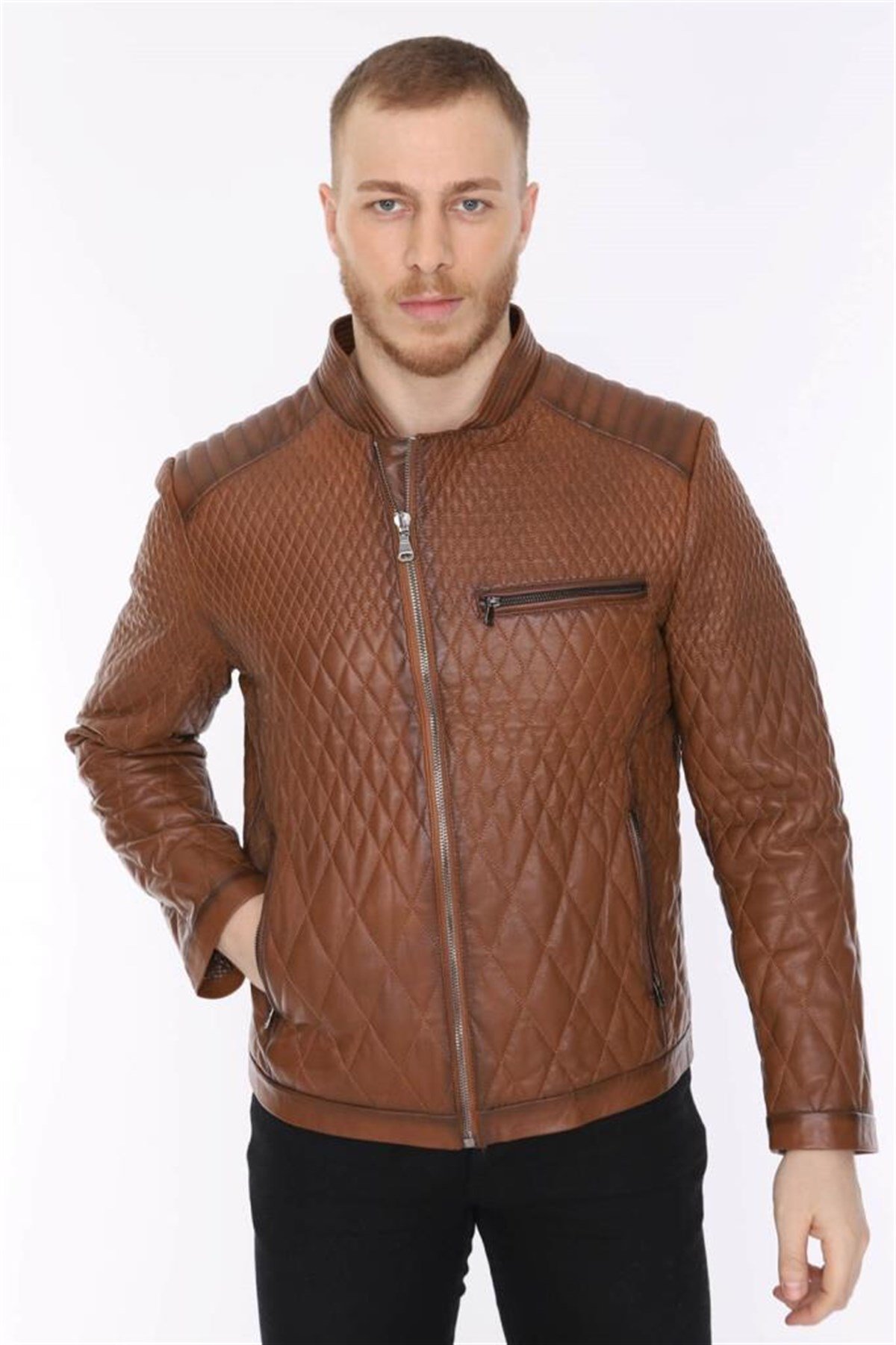 Hakiki Deri Taba Erkek Deri Mont Baklava Desen Fermuarlı Deri Ceket