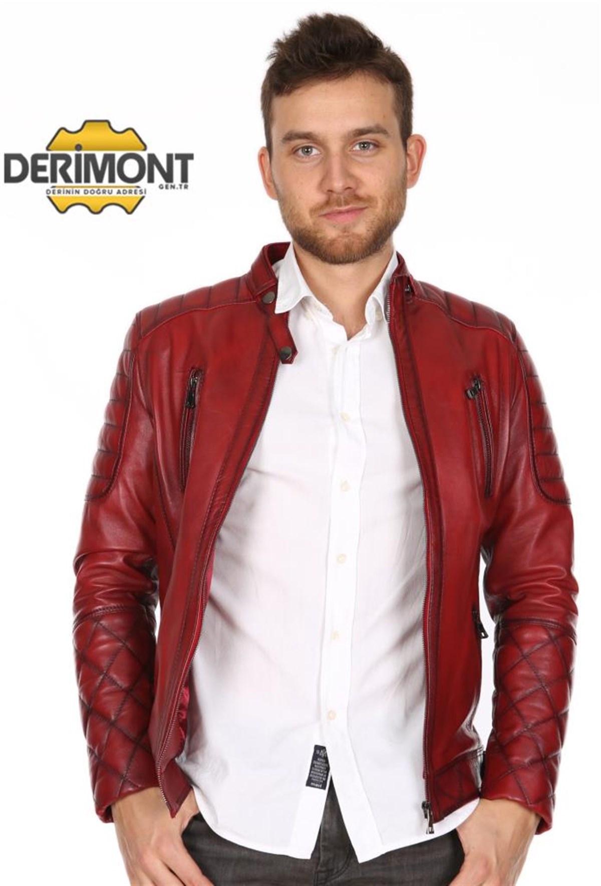 Hakiki Deri Kırmızı Erkek Deri Mont Düz Çizgili Baklava Desenli Fermuarlı Deri Ceket (509-876)