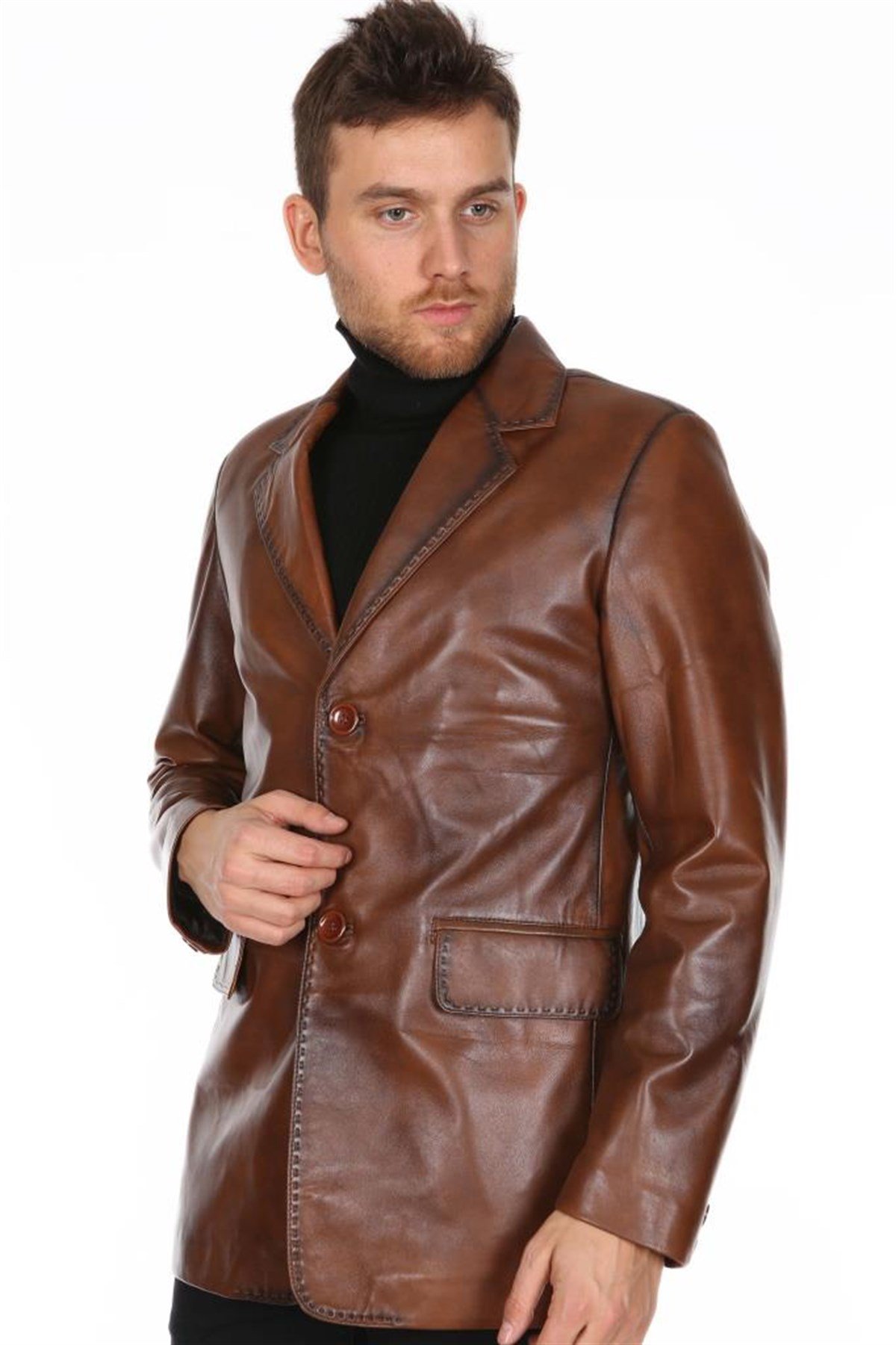 Hakiki Deri Taba Erkek Deri Mont Dikiş İşlemeli Düğme Detaylı Deri Ceket