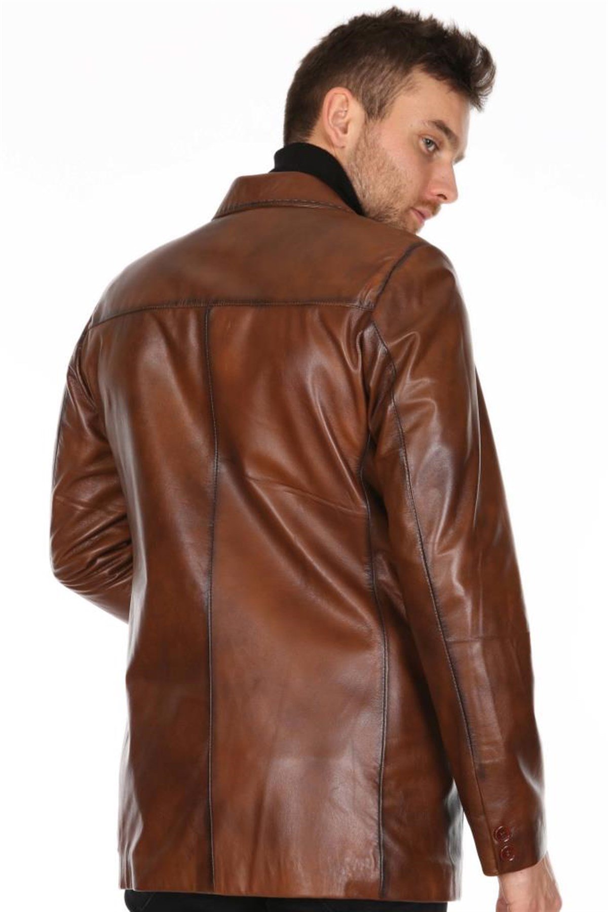 Hakiki Deri Taba Erkek Deri Mont Dikiş İşlemeli Düğmeli Deri Ceket (e-163-76-206)